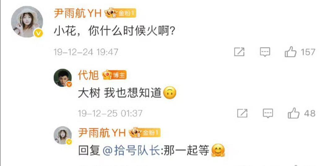 她叫他小花,他叫她大树,听起来像是反过来了,其实一点不别扭,小花需要依靠,大树负责撑着,这种关系不是嘴上说出来的,是时间里慢慢形成的。很多人后来考古他们的互动,发现没有刻意的秀恩爱,没有情绪化的宣言,更多是日常的调侃和陪伴,2019年,她问过他一句,小花,你什么时候火,他回了一句,大树,我也想知道,当时看只是轻松一笑,现在再看,像一段被时间盖过章的记录。